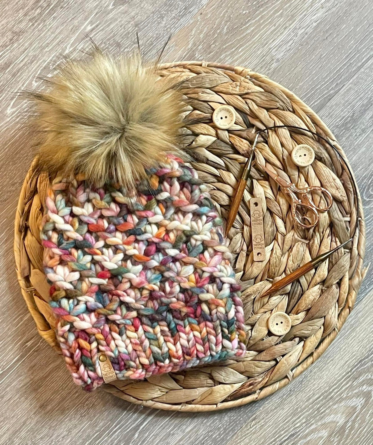 - Yarn is 100% merino wool and includes a large faux fur pom pom made by me.